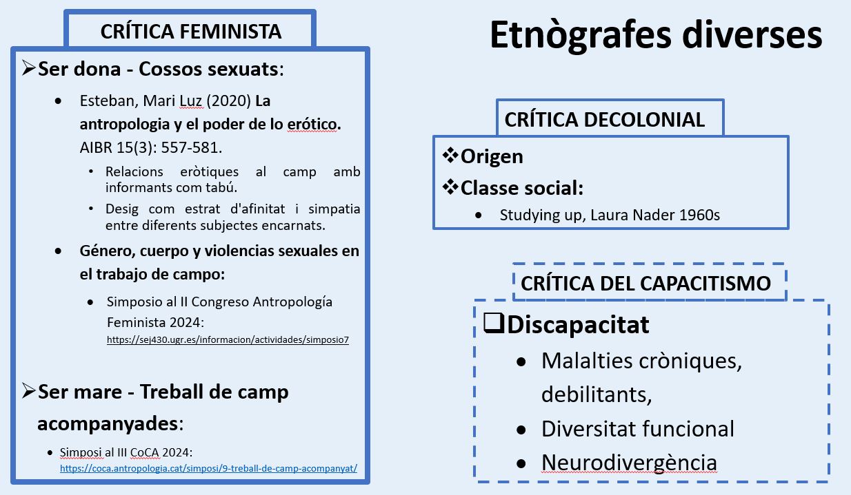 Termino esta breve entrada con la reflexión de que el capacitismo impregna asunciones sobre el trabajo de campo y que necesitamos pensar métodos más accesibles para esta diversidad de etnógrafas como puede ser la etnografía digital, el uso herramientas digitales, la etnografía en silla de ruedas, el cuestionamiento del imaginario trabajo de campo como actividad solitaria, la etnografía a retazos, etc.